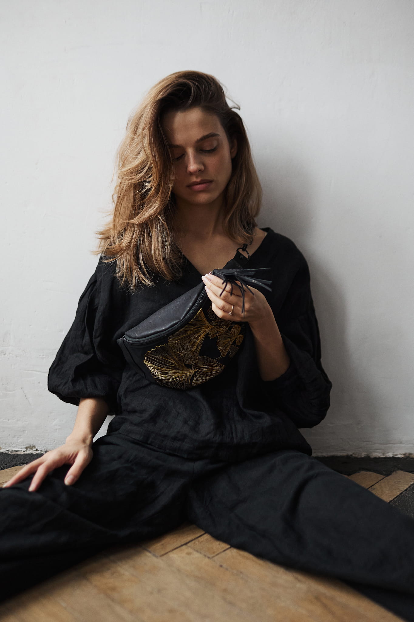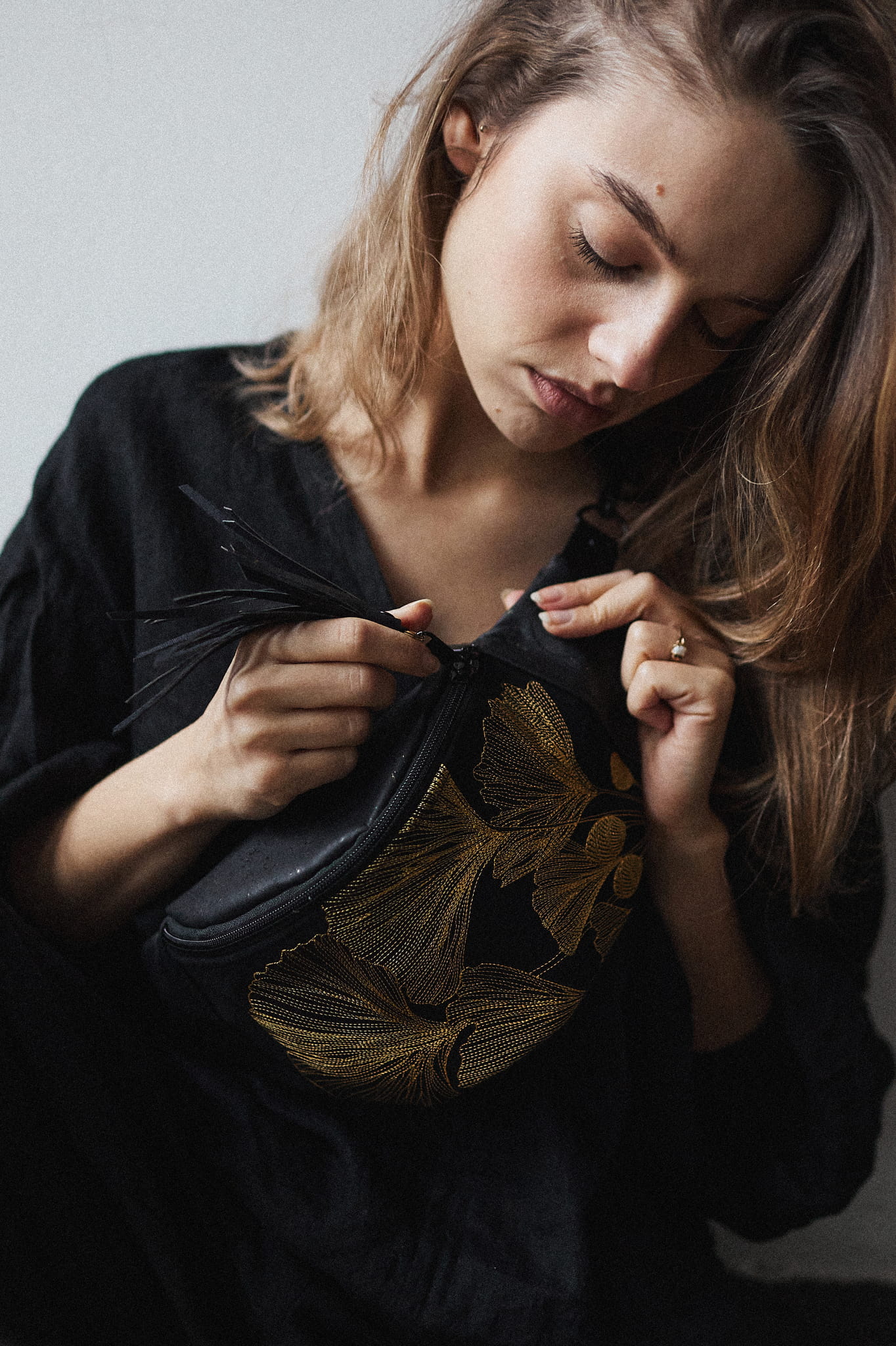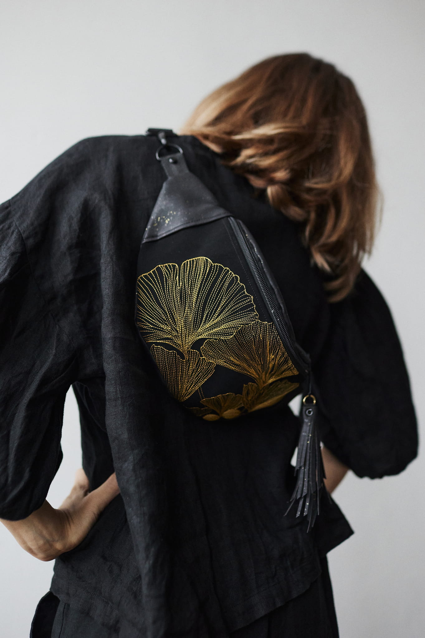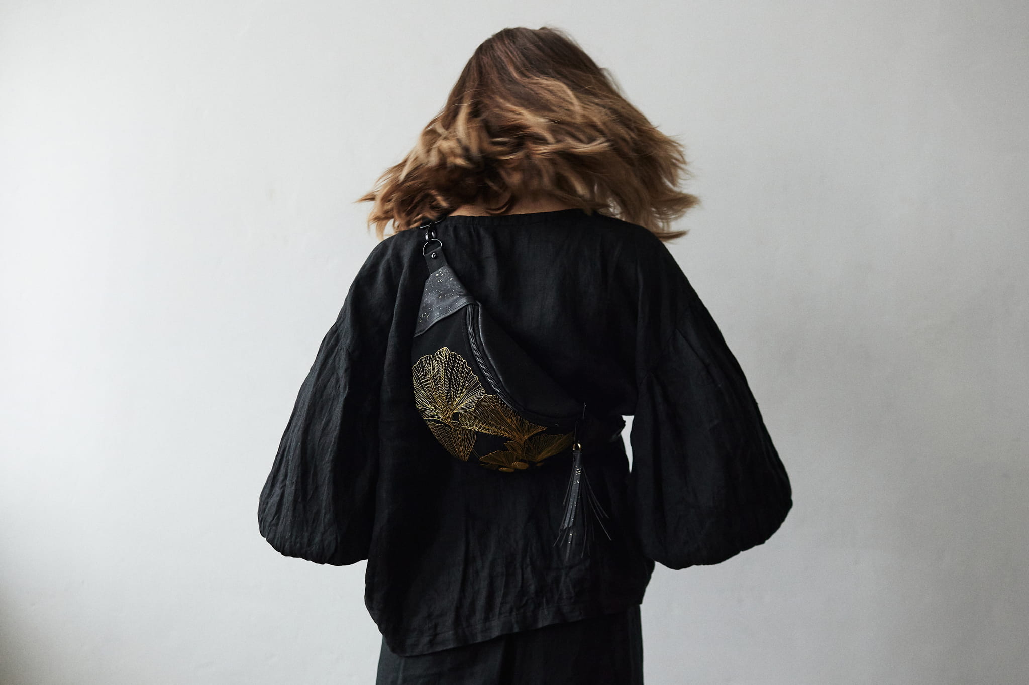 Urzekający haft wykonany jest na czarnym, matowym froncie z eko-nubuku, który stanowi idealne tło i podkreśla połysk nici w kolorze jasno-złotym.