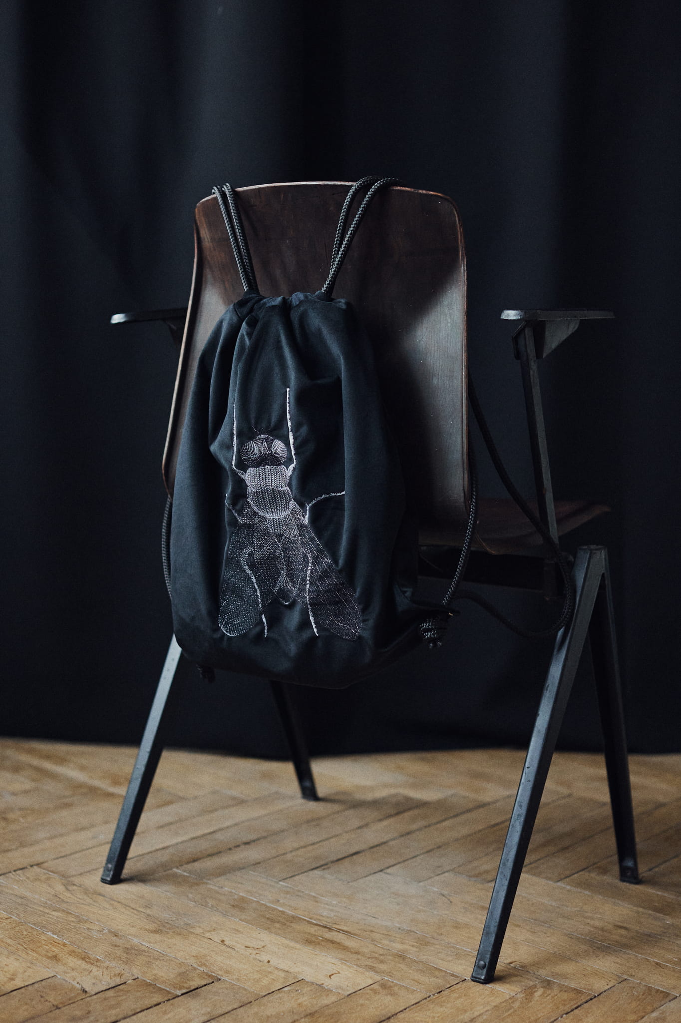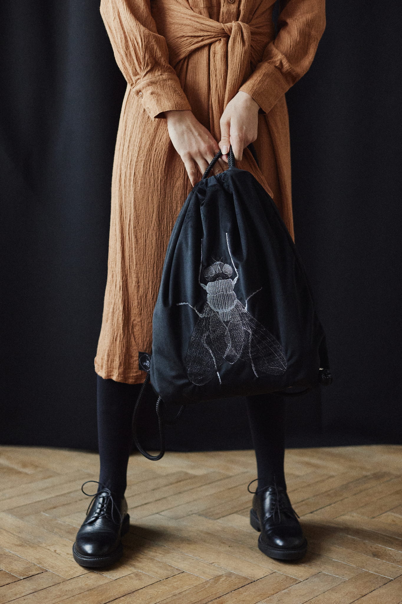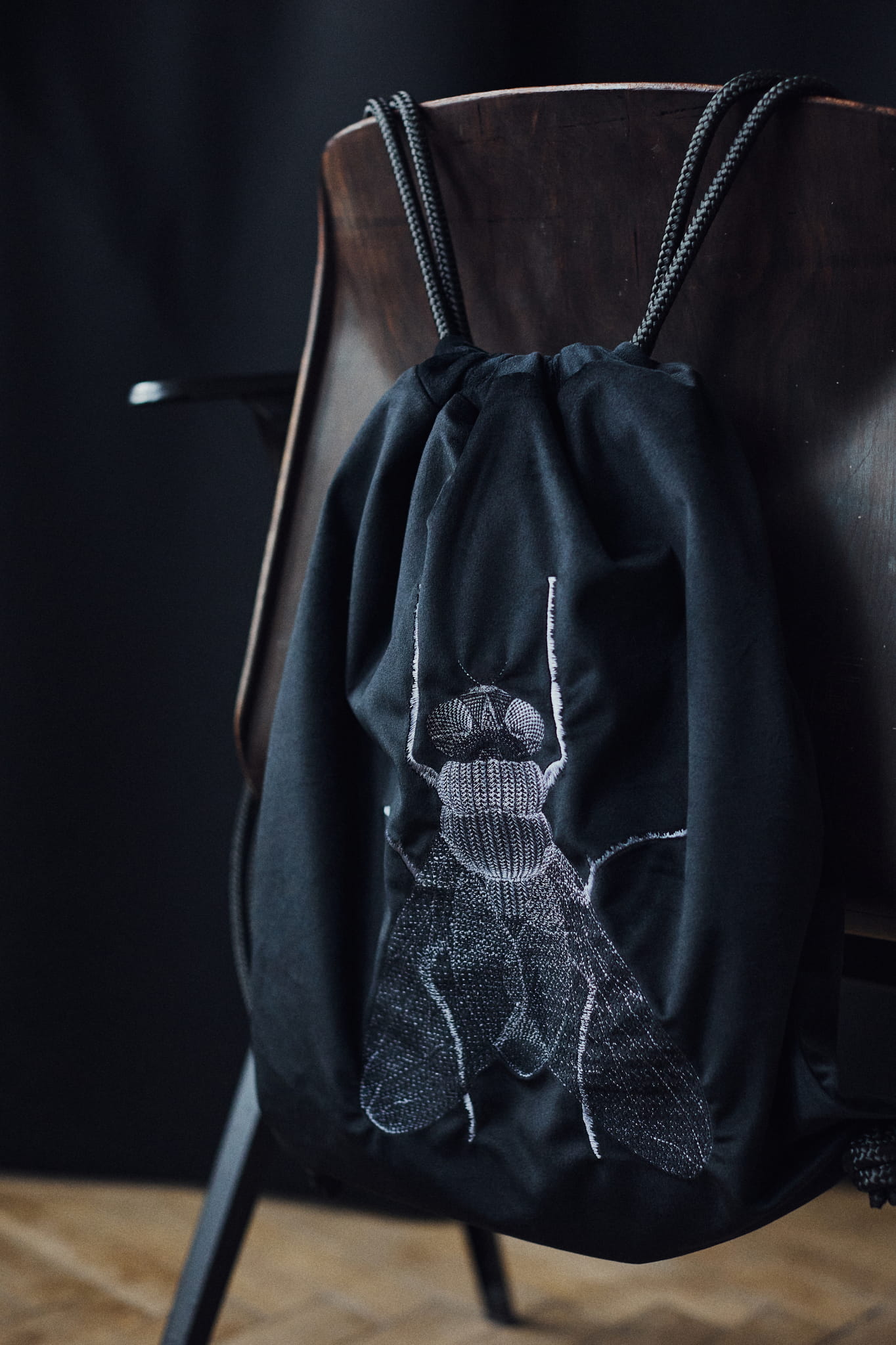 Niezwykły plecak w formie worka w kolorze głębokiej czerni. Dodatkowo zdobi go efektowny, autorski haft muchy. Haft wyróżnia się fakturą. Nici wtapiają się w aksamitną tkaninę. Subtelny połysk haftu wybija się z velvetu.