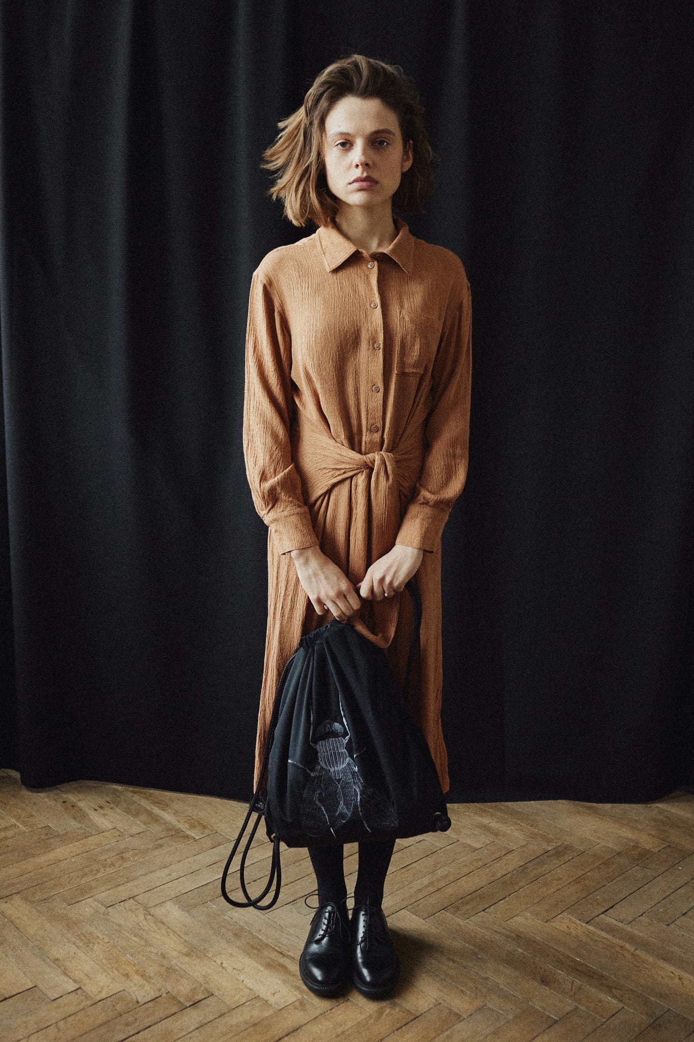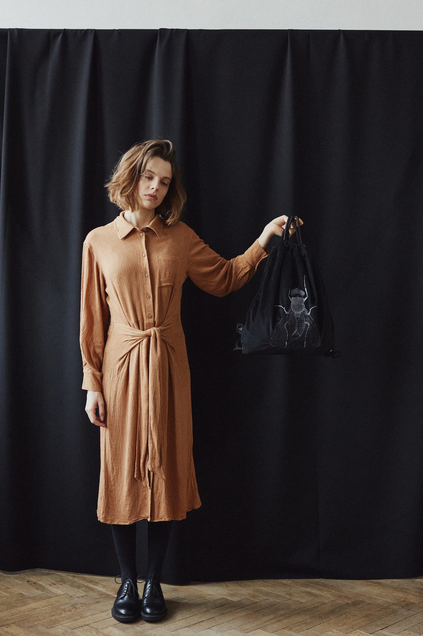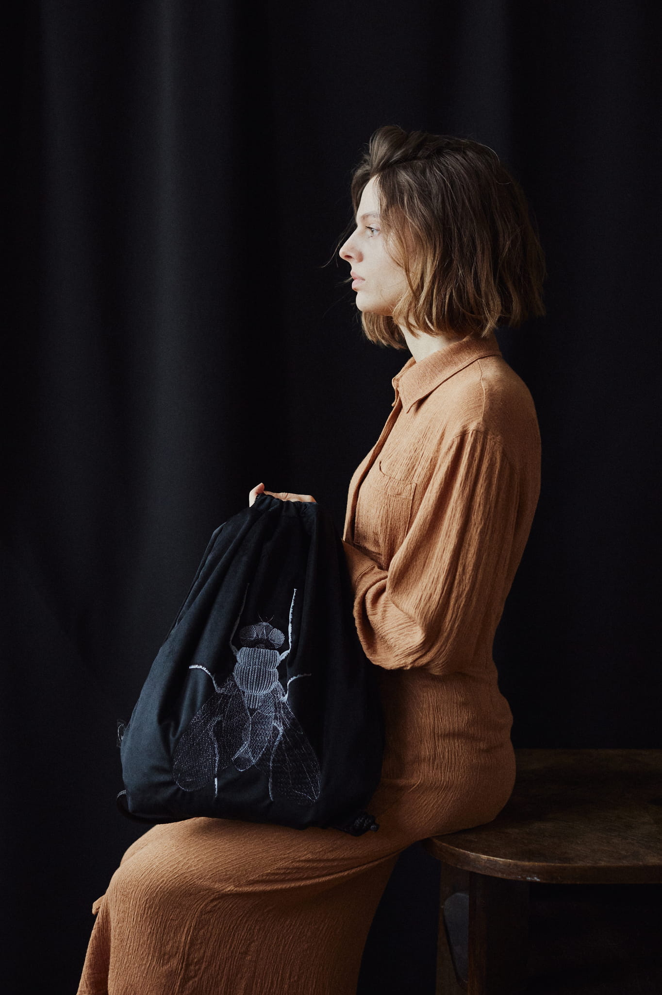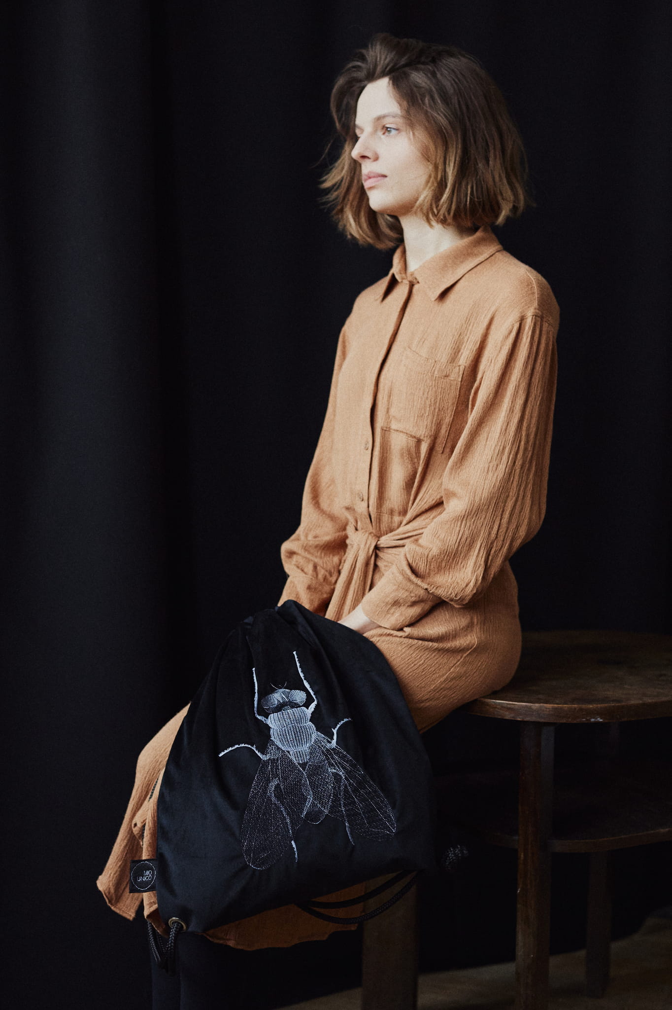 Niezwykły plecak w formie worka w kolorze głębokiej czerni. Dodatkowo zdobi go efektowny, autorski haft muchy. Haft wyróżnia się fakturą. Nici wtapiają się w aksamitną tkaninę. Subtelny połysk haftu wybija się z velvetu.