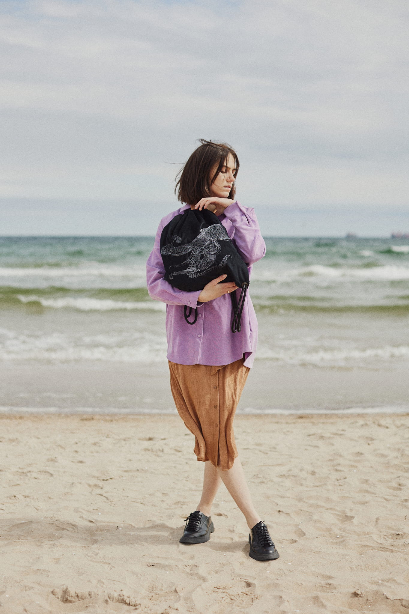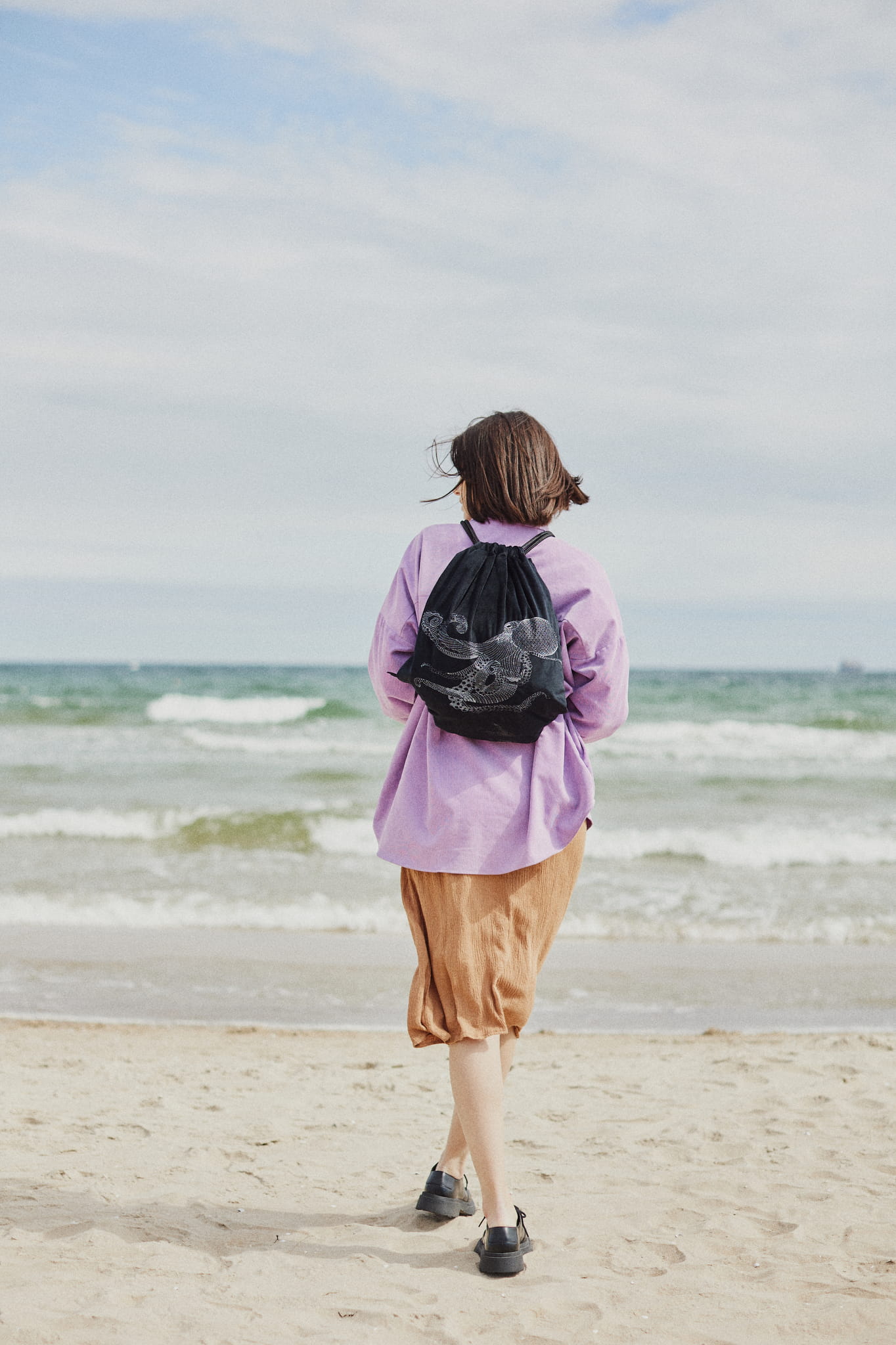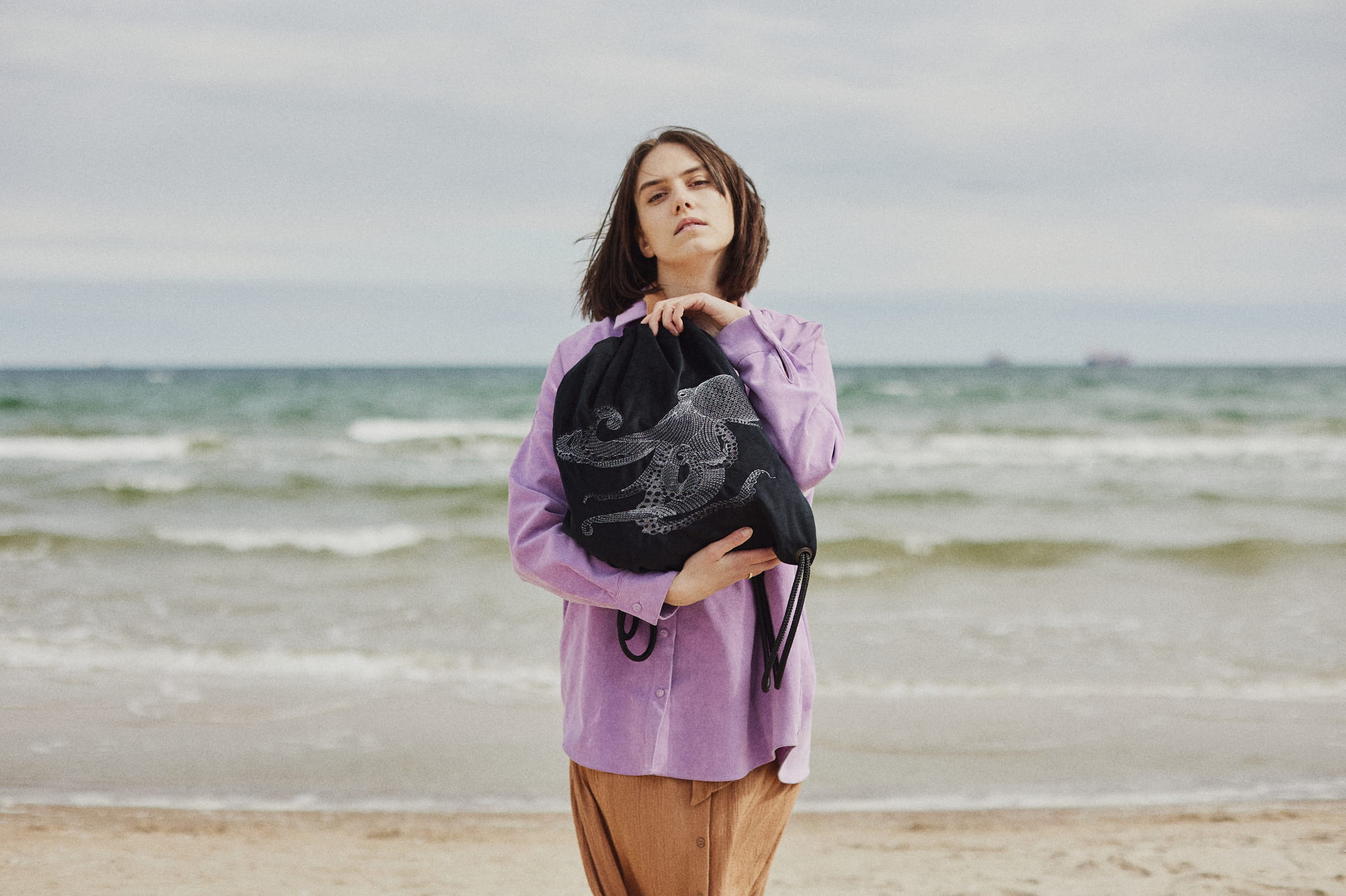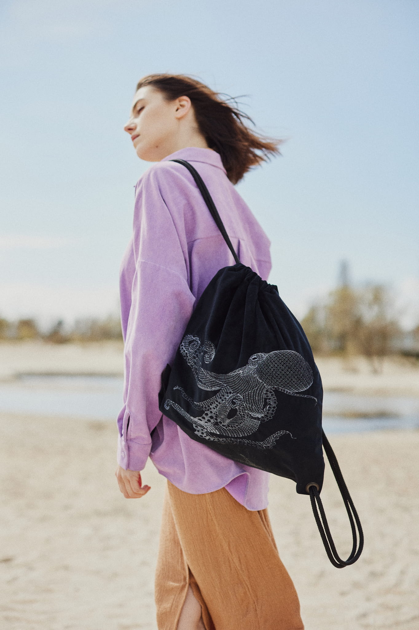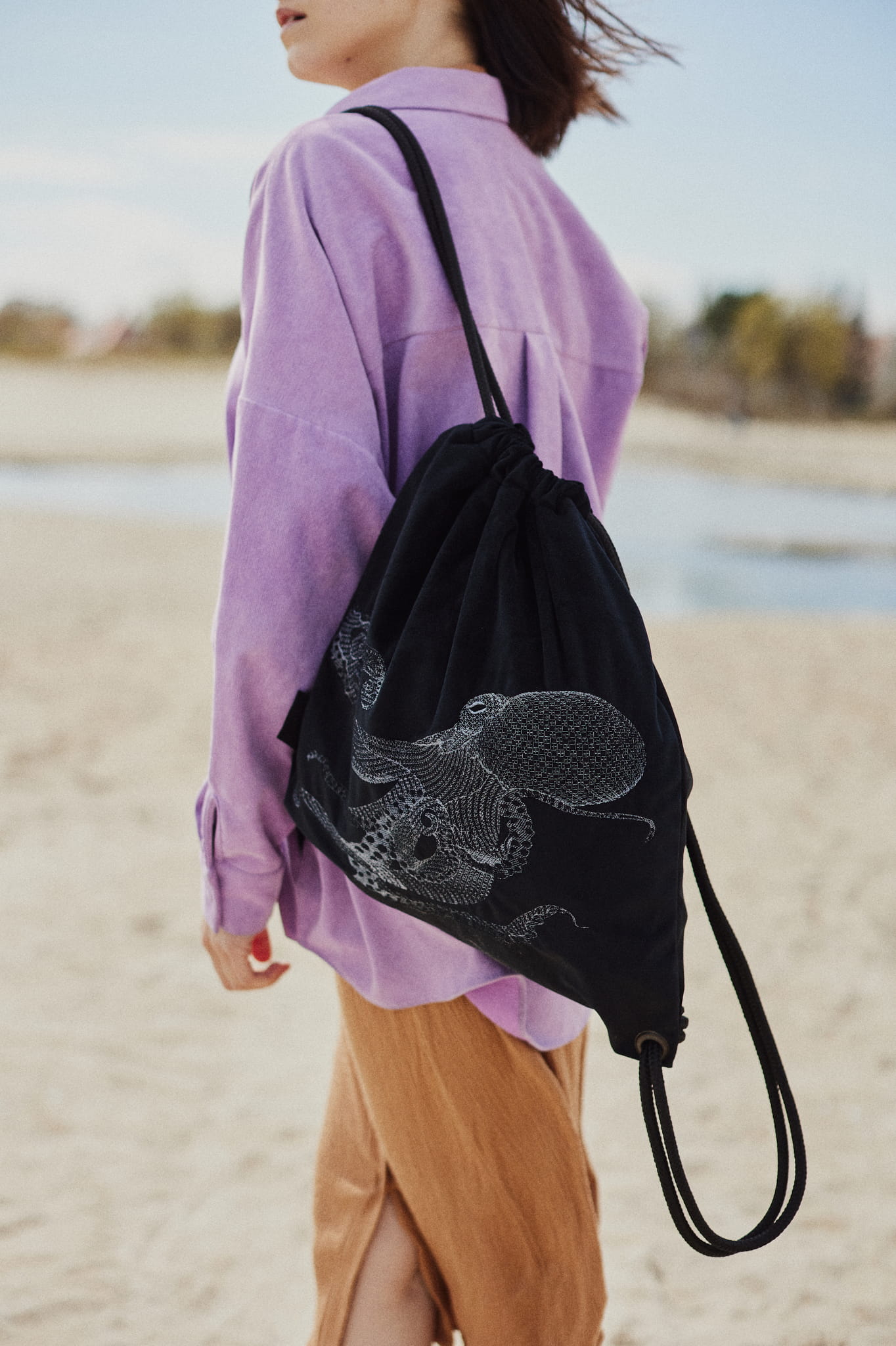 Niezwykły plecak w formie worka w kolorze głębokiej czerni. Dodatkowo zdobi go efektowny, autorski haft - ośmiornica. Haft wyróżnia się fakturą. Nici wtapiają się w aksamitną tkaninę. Subtelny połysk haftu wybija się z velvetu.